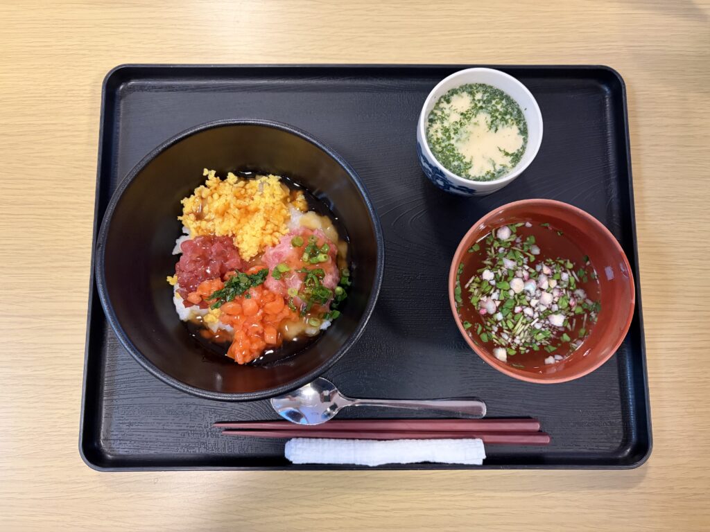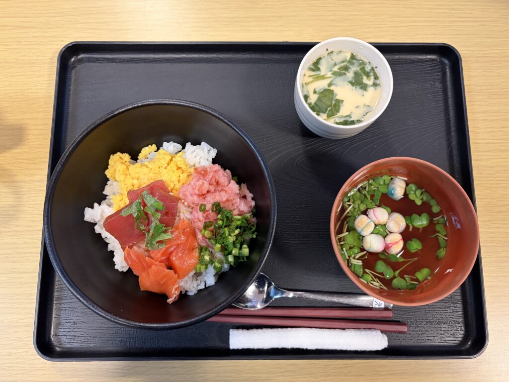 最近、入居された方のご家族様に「お刺身が嫌いなんだけど、施設は刺身なんで出ないでしょう?」と聞かれました。いいえ、施設でも冬場だけにはなりますが、ご用意しています。本日のメニューは「海鮮丼」でした。お刺身やお寿司は大変喜ばれるメニューです。食事をお持ちすると「わぁ、今日お寿司なの?うれしい」「茶碗蒸しに銀杏も入っていていいね」とうれしいお言葉をかけていただきました。刺身が嫌いな方にはちゃんと別メニューをご用意しています。しばらくはお刺身の提供ができるので、楽しみにしていてくださいね☆