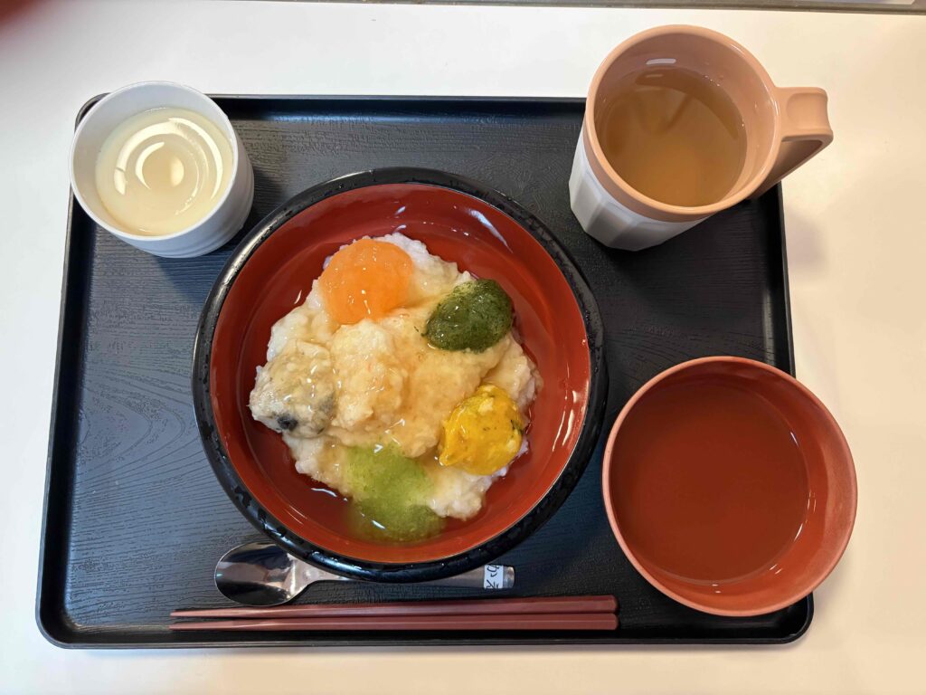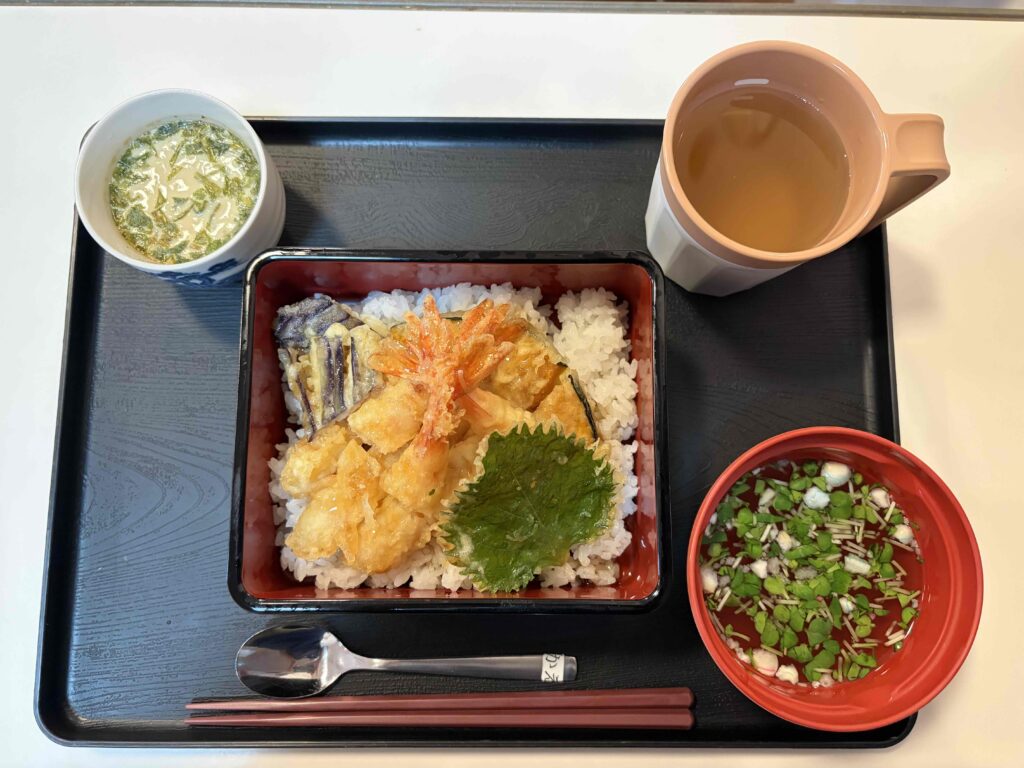 今回のお楽しみメニューは「天丼・茶碗蒸し・すまし汁」でした。海老が3尾も入っており、ご利用者様に大変満足していただけました。普段小食の方も、この日はペロリと完食されていました。「美味しかったわ~」と素敵な笑顔を見せてくださいました。そろそろ刺身が出せる時期になりました。来月はお刺身をご用意したいと思います。