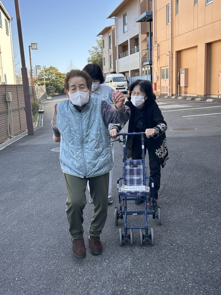 寒い冬の日でも「外を歩きたい」とおっしゃるほど、散歩への意欲がとても高く、その姿には私たち職員も驚かされます。いつまでも前向きに体を動かし、元気に過ごされているお姿は本当に素晴らしく、私たちにとっても大きな励みとなっています。これからもお元気に、毎日を楽しく過ごしていただきたいと思います。