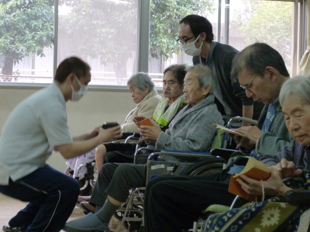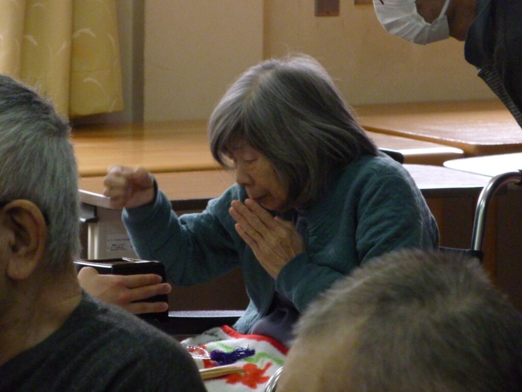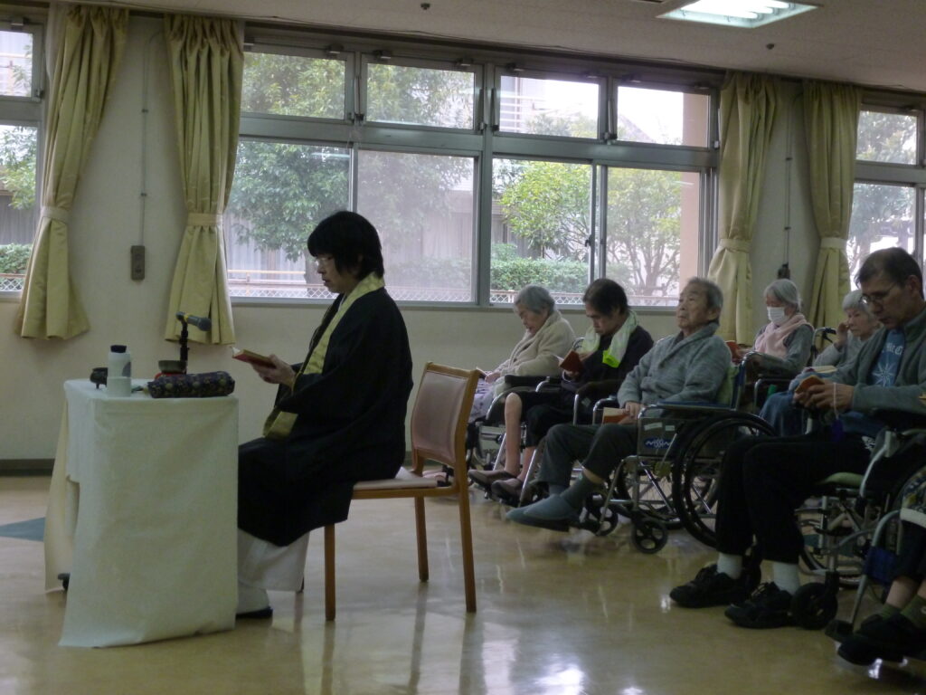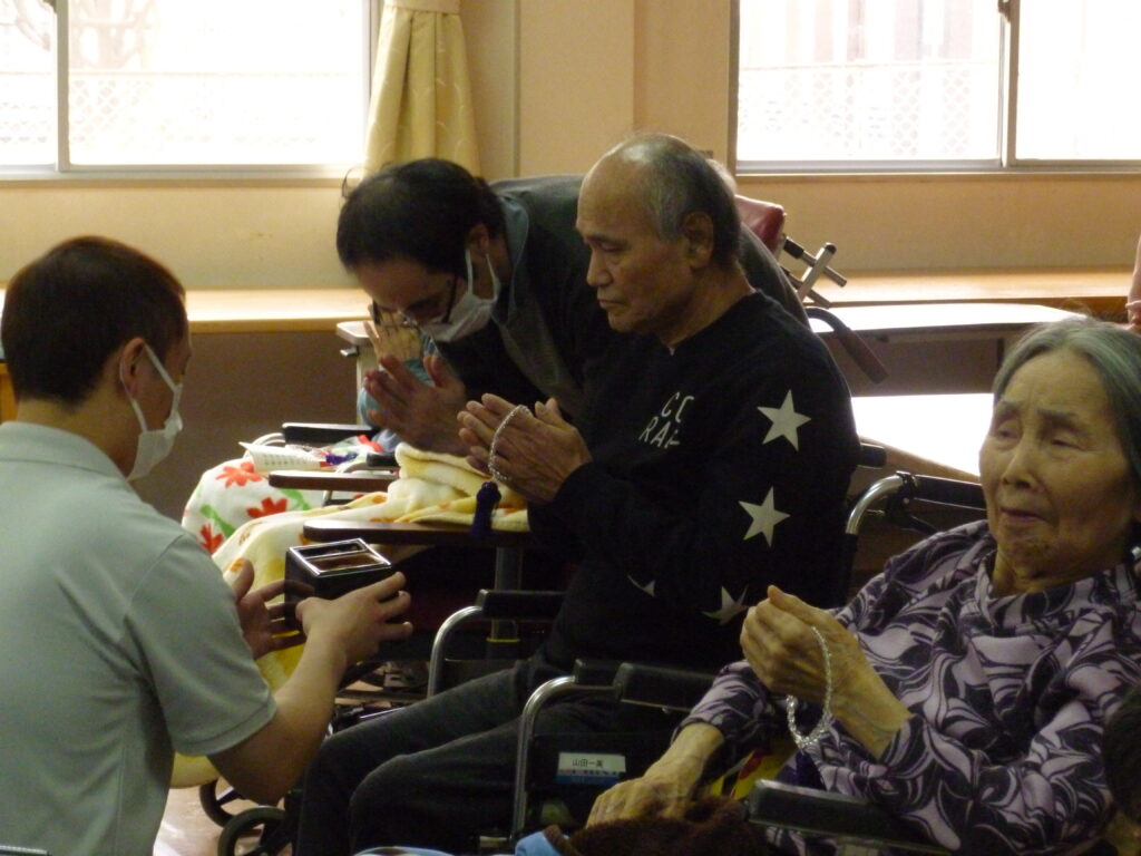 3月13日、特別養護老人ホームにて彼岸法要が行われました。当日は浅井僧侶にお経をあげていただき、ご利用者様は順番にご焼香をされました。焼香後には手を合わせ、それぞれに故人へ思いを寄せておられるご様子が見られました。その後、浅井僧侶によるお説法を拝聴し、厳かな雰囲気の中、皆様それぞれ穏やかなひとときを過ごされていました。