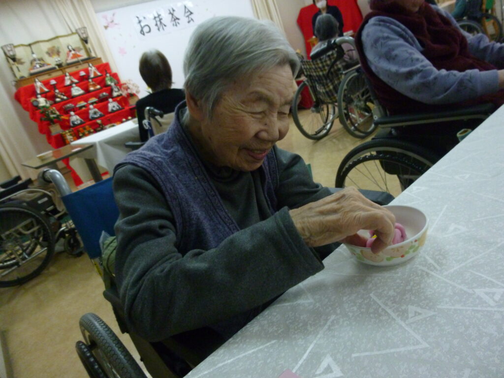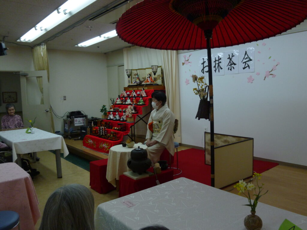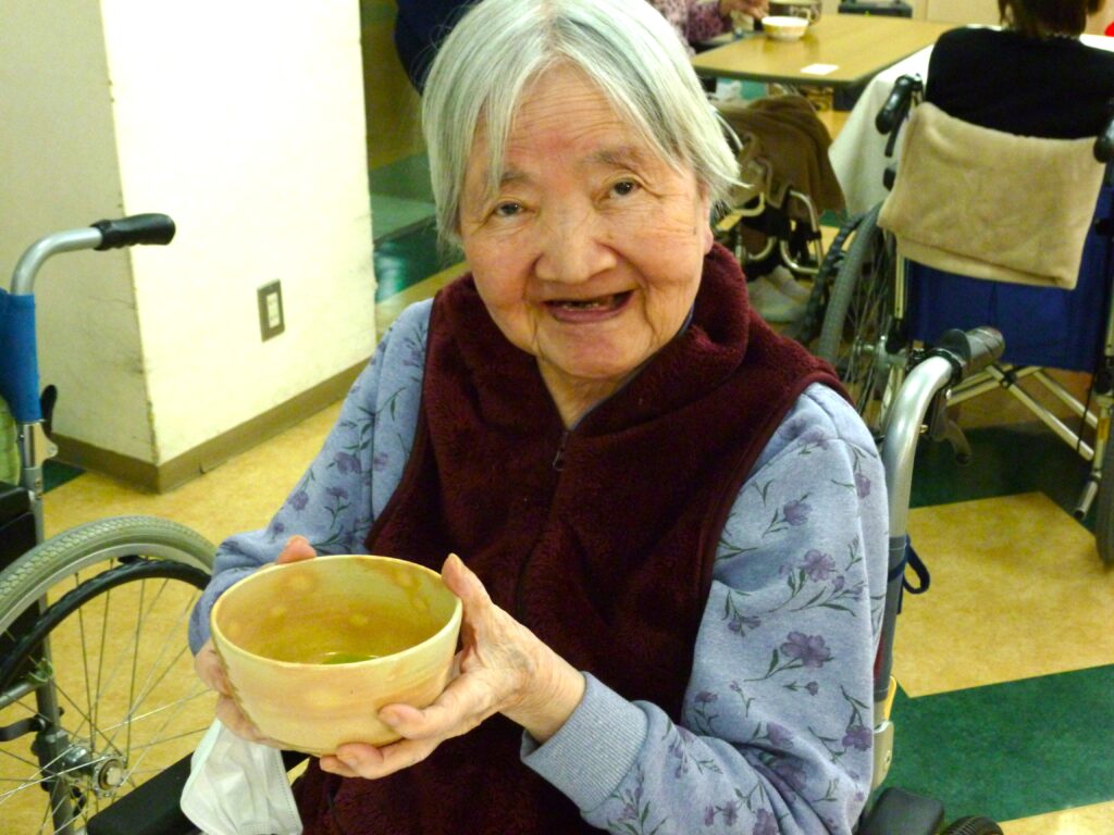 先日、当施設にて「お抹茶会」を開催いたしました。いつもとは少し違う、落ち着いた和の雰囲気の中で、ご利用者様にゆったりとした時間を過ごしていただきました。当日は施設長が着物でお茶をたて、会場は一気に本格的なお茶会の空気に包まれました。職員も白や黒を基調とした装いで参加し、普段とは異なる特別な雰囲気を演出しました。提供されたのは練り切りや羊羹といった和菓子。見た目の美しさに「きれいだね」「食べるのがもったいない」といった声が聞かれ、味だけでなく目でも楽しんでいただけた様子でした。これからも、ご利用者様に季節を感じていただける行事や、心が安らぐ時間を大切にしていきたいと思います。