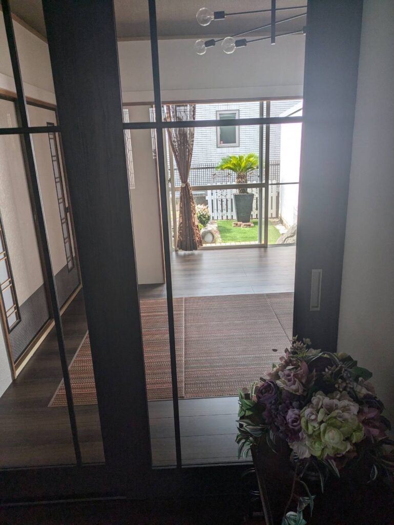 35年前、家を建てた時からずっと、玄関の先にある和室の壁に圧迫感を感じており、やっと和室のリフォームを実現する事ができました。完成した和室は、昼間玄関を入るとガラスドアから和室を通してソテツの木が真正面に見え、南国感に溢れる雰囲気。夜になり真っ暗な部屋に照明スタンドのあかりが「アースカラー」の畳を照らし、畳の色が浮き出て素晴らしい空間となり、とても感動しています。リフォームって生活感を変えるので素晴らしい!