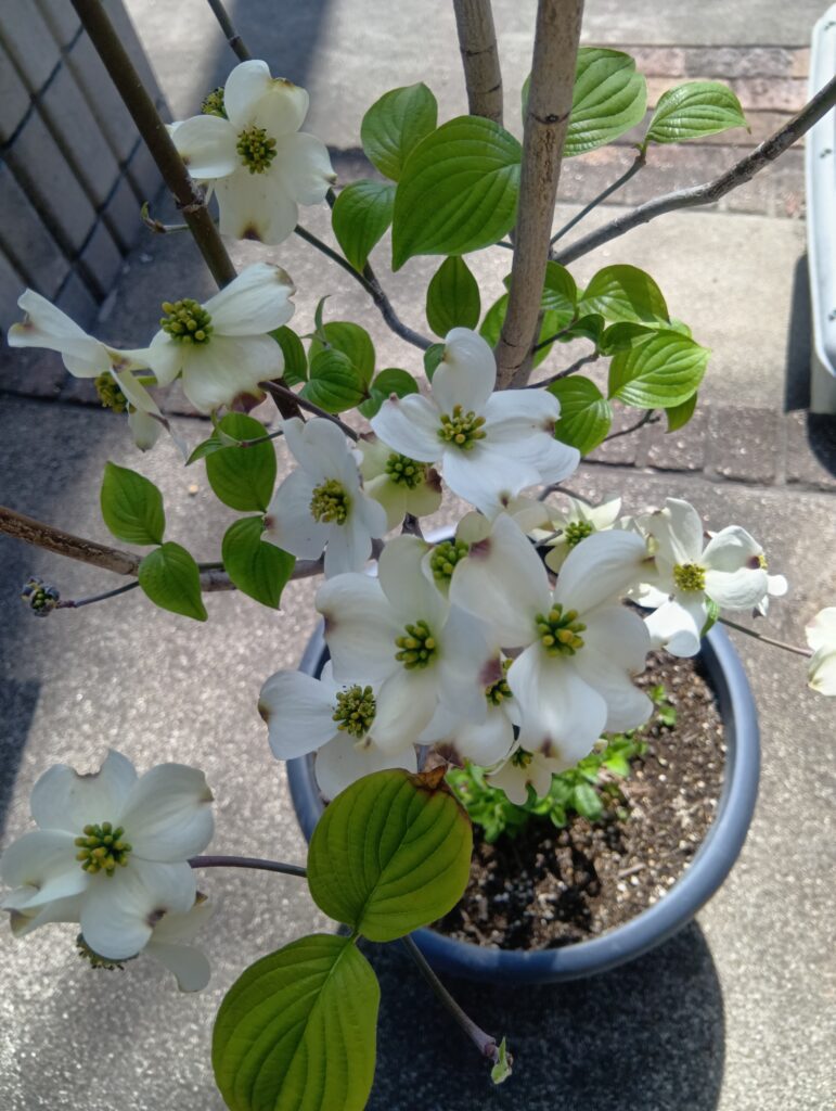 わが家にはシンボルツリーと呼ばれる木がなかったので3年前にハナミズキの苗木を購入しました。最初は40cmくらいの小さな木で、植えてすぐに「うどん粉病」にかかってしまい、葉っぱが白くなり弱ってしまいました。気づいてすぐに消毒をすると、その後はすくすくと育ち、今年の4月に初めて花が咲きました。ハナミズキの花は他と違って最初は緑色の花が咲き、その後だんだんと白色に変化するものでした。じっと花を眺めていると心が癒されるようで、来年の春がとても楽しみです。