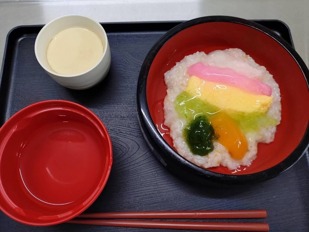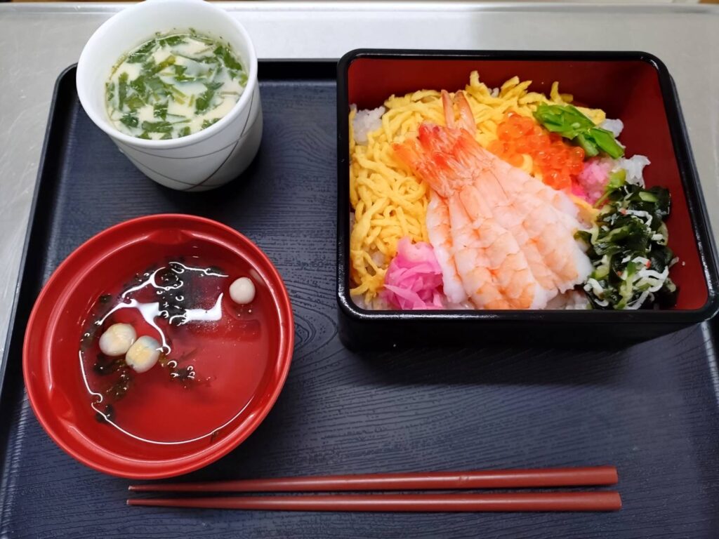 今回のお楽しみメニューは「ちらし寿司、茶碗蒸し、味噌汁」でした。酢飯の酢が効いていて、食欲が湧きました。普段は食が細くあまりたくさん食べられない方も、酢飯だとぱくぱく食べて下さいました。毎月お楽しみメニューのお知らせのポスターを貼っています。「いつもお知らせが貼られると待ち遠しくて」と、とても楽しみにされています。次回も楽しみにしていただけるようなメニューを考えていきたいです。