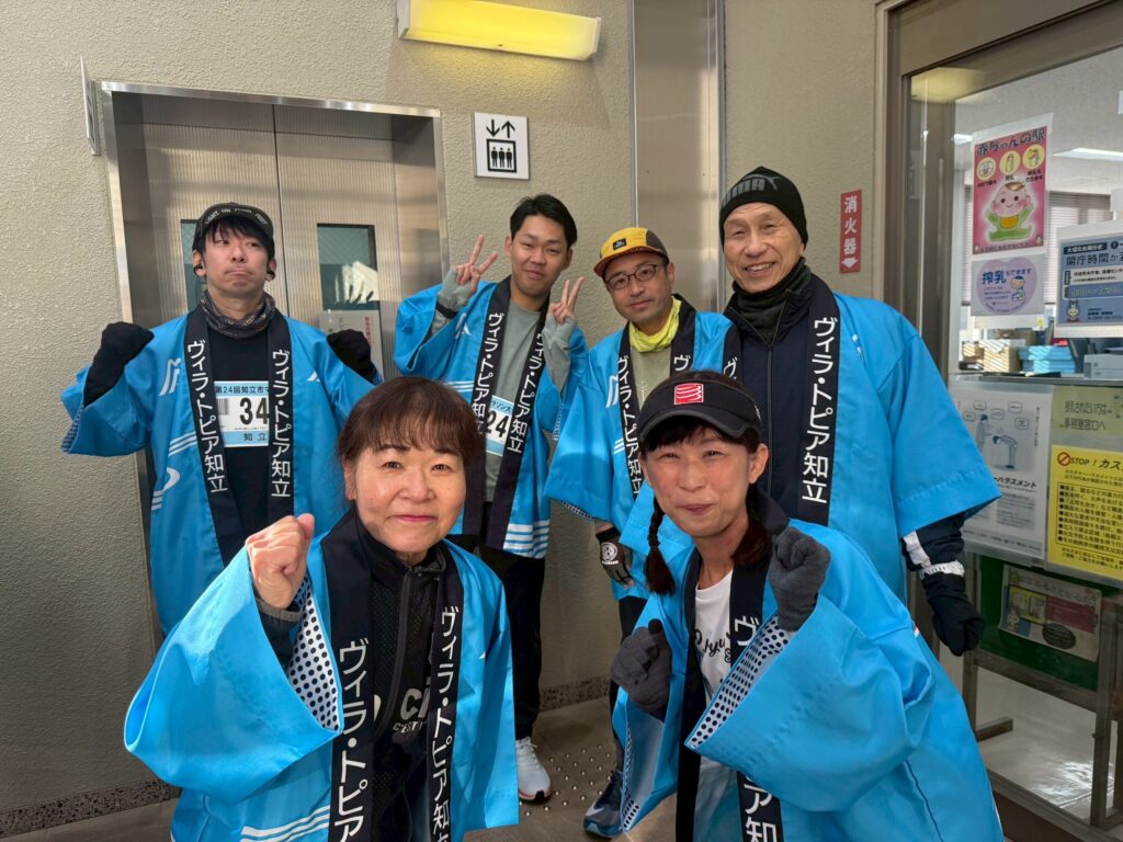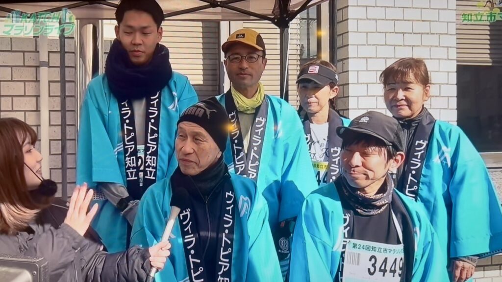 今年の知立マラソンには昨年と同じ6名がエントリーしました。「今年も頑張るぞー!」と士気を高めていたのですが、高齢メンバーの2名が相次いで負傷し、当日は4名の出走となってしまいました。各ランナーはほぼ目標タイムで完走でき満足。例年通りヴィラトピア知立の法被を着ていたのですが、何と!大会を生中継していたKATCH(ケーブルテレビ)から取材を受け放送されたのです。「思わぬ宣伝ができた」と、メンバー一同嬉しい思いで会場を後にしました。