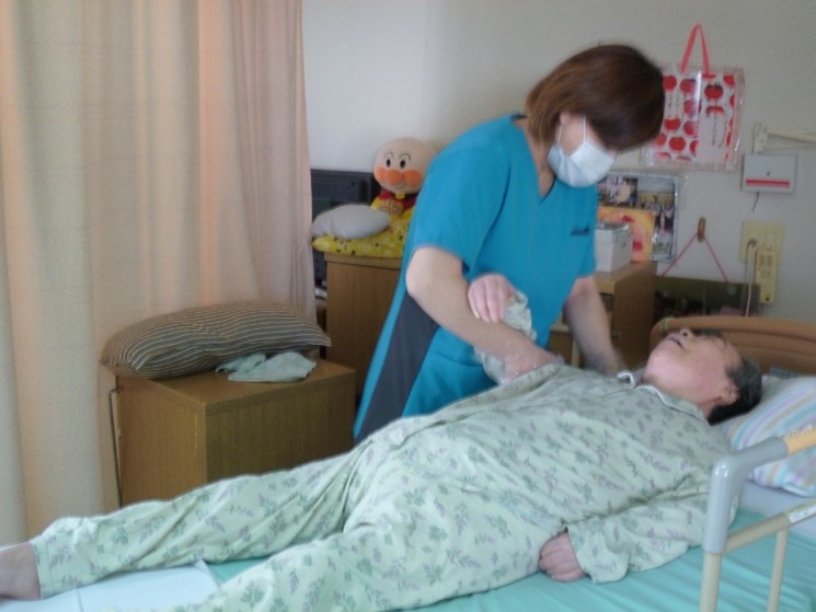写真は、「関節可動域訓練(かんせつかどういきくんれん)」の一場面です。関節可動域とは、関節の動く範囲のことを指し、主に腕や足を曲げたり伸ばしたり、回したりする可動範囲のことをいいます。施設入所されている方は、若い方と違い、病気や加齢、活動性低下などにより関節の可動範囲が低下している方が多くいらっしゃいます。当施設のリハビリでは、「関節可動域訓練」にて関節可動域の拡大に努め、同時に筋肉の柔軟性を改善することで、筋力を発揮しやすくし、自由に手足が使えるようにリハビリを進めています。また、ご自身で体を動かすことが難しい方に関しては、この訓練を実施することで関節拘縮(関節が固まって動かせなくなる状態)を予防し、循環を改善することで褥瘡(床ずれ)などの2次的障害の予防にもつなげています。